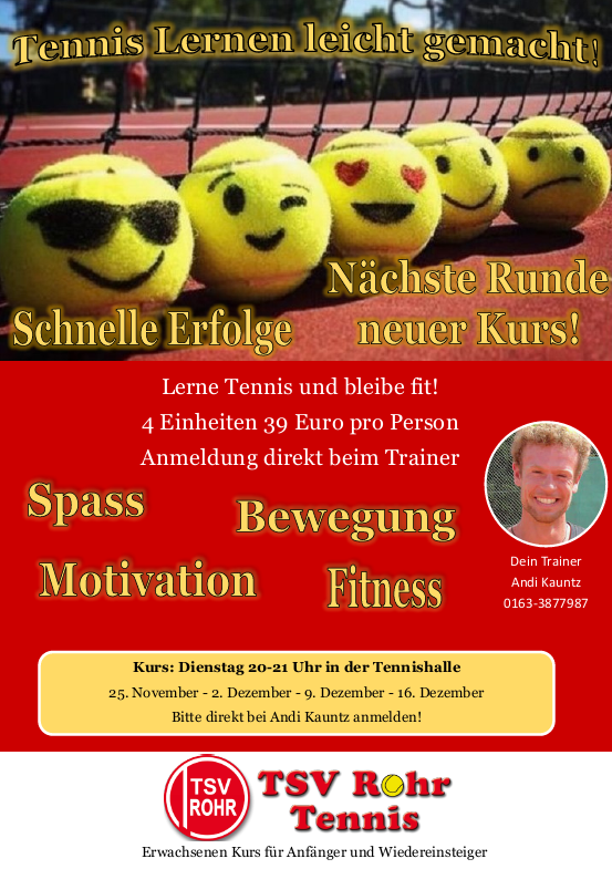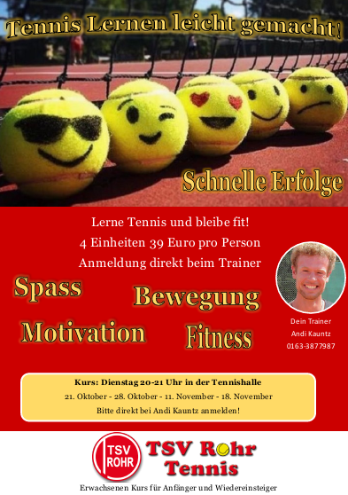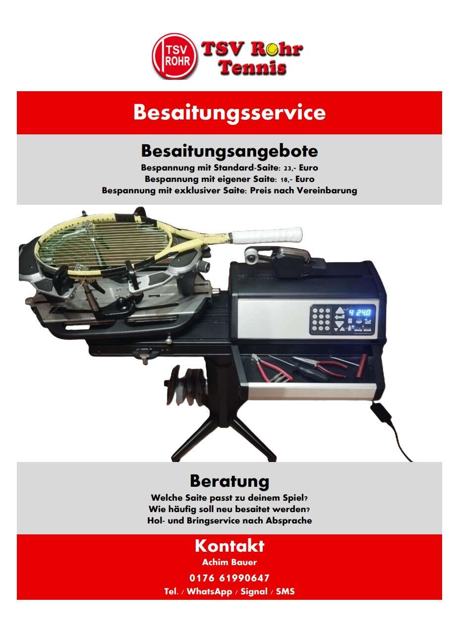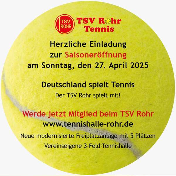 Falls der ein oder andere heute an diesem grauen und kalten Samstagabend noch nichts zu tun hat und den Tag erfolgreich (hoffentlich) und erwärmend ausklingen lassen will, kann gerne ab 17 Uhr im Bistro der Tennishalle Rohr unsere zweite Mannschaft bei ihrem Saisonauftakt gegen Schwaig unterstützen.