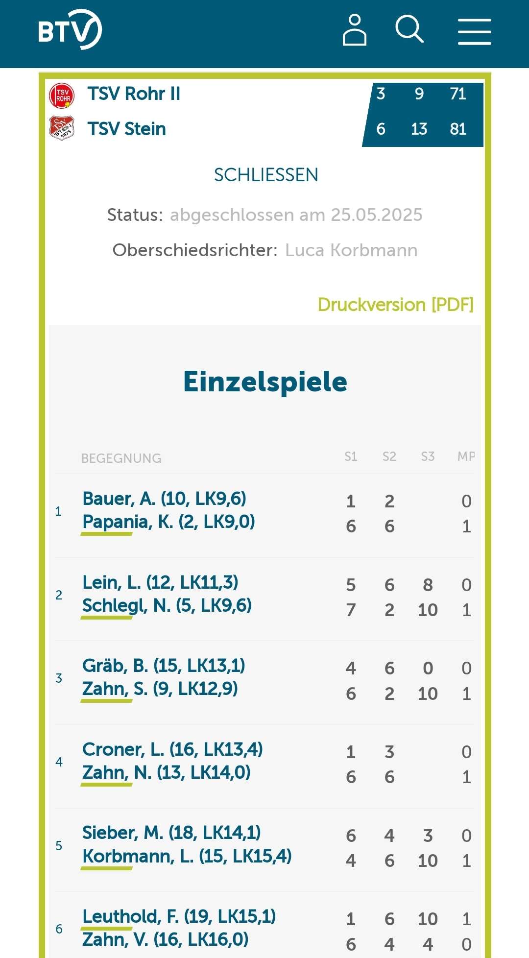 Damit führten die Rohrer nach den Einzelspielen mit 3:1 und sahen den Sieg bereits in greifbarer Nähe.