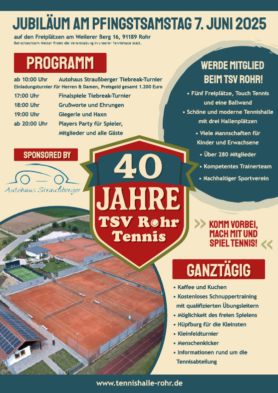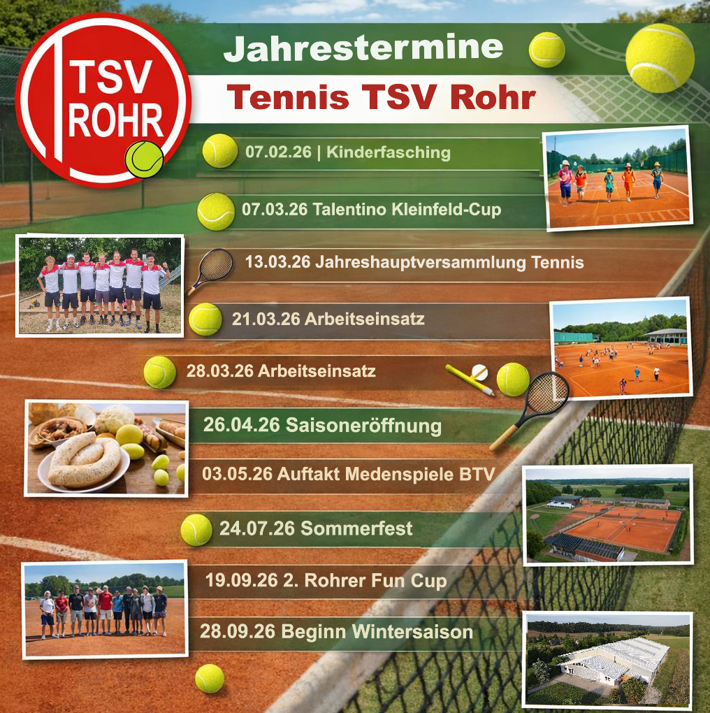 Zur besseren Planung anbei alle bereits feststehenden Tennistermine für das Jahr 2026. Die Termine findet ihr auch alle auf unserer Homepage bzw. in unserer App.