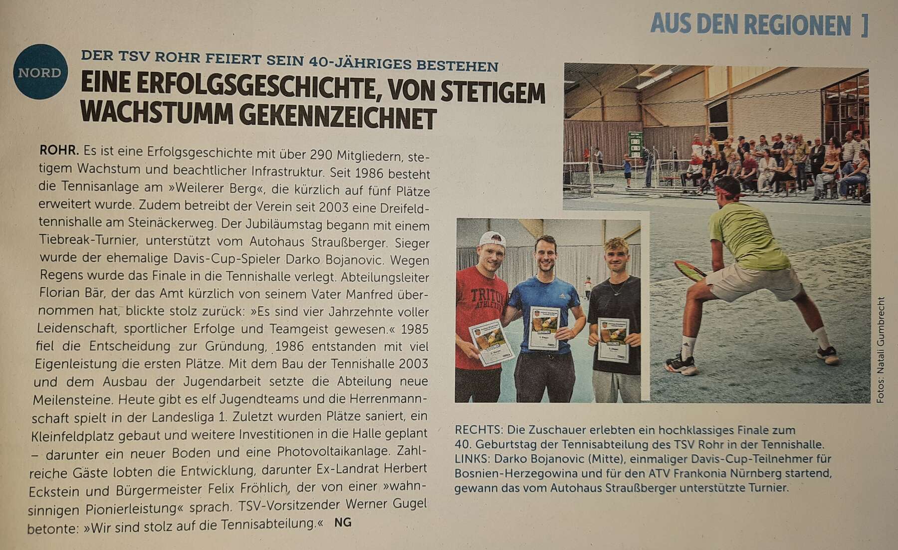 Auf Position 2 und 4 starteten die zwei Youngstars des TSV Rohr , Breno Frauenschläger und Manuel Gastner. Während Manuel seinem Gegner nicht den Hauch einer Chance ließ und sich mit 6:0 6:2 durchsetzte (der Gegner fragte sich kurzzeitig ob die Mannschaft in der Regionalliga gemeldet sei), musste sich Breno nach einem Comeback in Satz zwei leider doch mit 3:6 6:7 geschlagen geben.