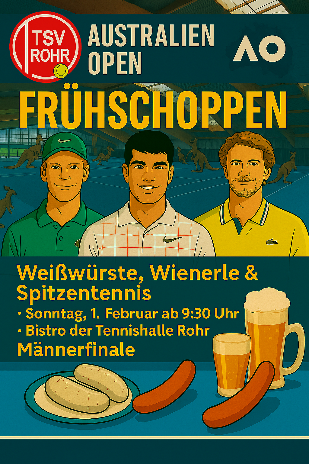am Sonntag um 9:30 Uhr laden wir euch herzlich zum Australian Open Frühschoppen in das Bistro der Tennishalle Rohr ein! Gemeinsam schauen wir das Herren-Finale der Australian Open – vielleicht sogar mit deutscher Beteiligung. In jedem Fall erwartet uns hochklassiges Tennis und ein gemütlicher Vormittag in bester Gesellschaft. Für Getränke und gute Stimmung ist gesorgt. Bitte in unserer App unter Termine wegen Planung anmelden!
