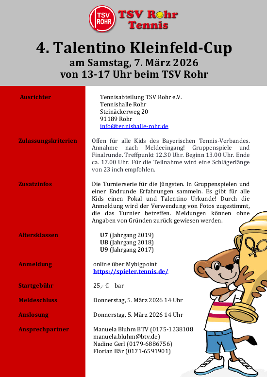 Am Samstag, den 7. März 26 findet ab 13 Uhr das 4. Talentino Kleinfeld Turnier für die Altersklassen U7, U8 und U9 in unserer Halle statt. Wir wollen damit den Jüngsten die Möglichkeit geben erste Turniererfahrungen zu sammeln. Alle notwendigen Informationen gibt’s in der Ausschreibung. Anmeldung bitte direkt über myBigPoint online beim BTV durchführen.