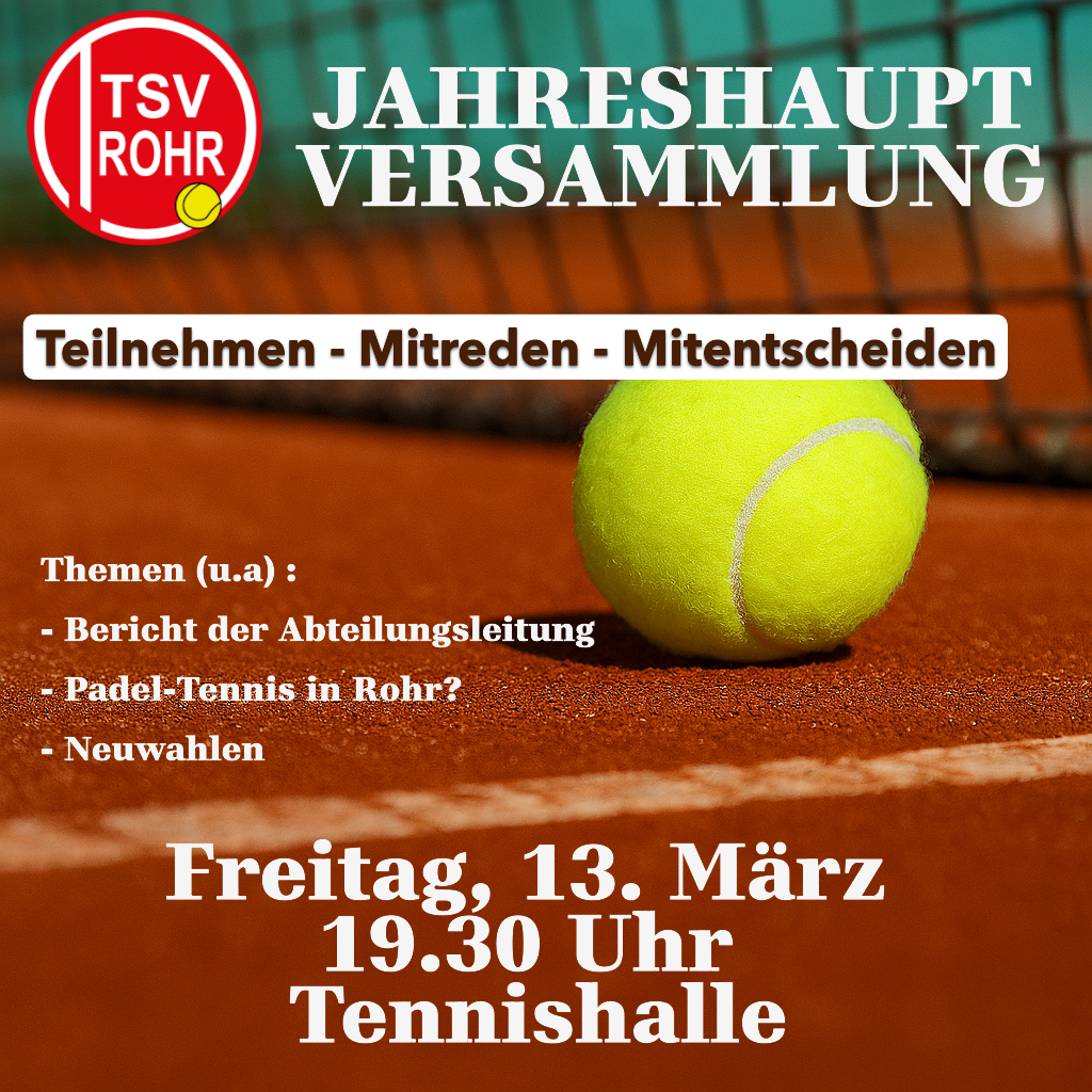 Unsere diesjährige Jahreshauptversammlung findet am Freitag, den 13.3. um 19.30 Uhr im Bistro der Tennishalle statt. Dieses Jahr finden Neuwahlen der Abteilungsleitung statt. Die Abteilungsleitung bittet um zahlreiche Teilnahme!